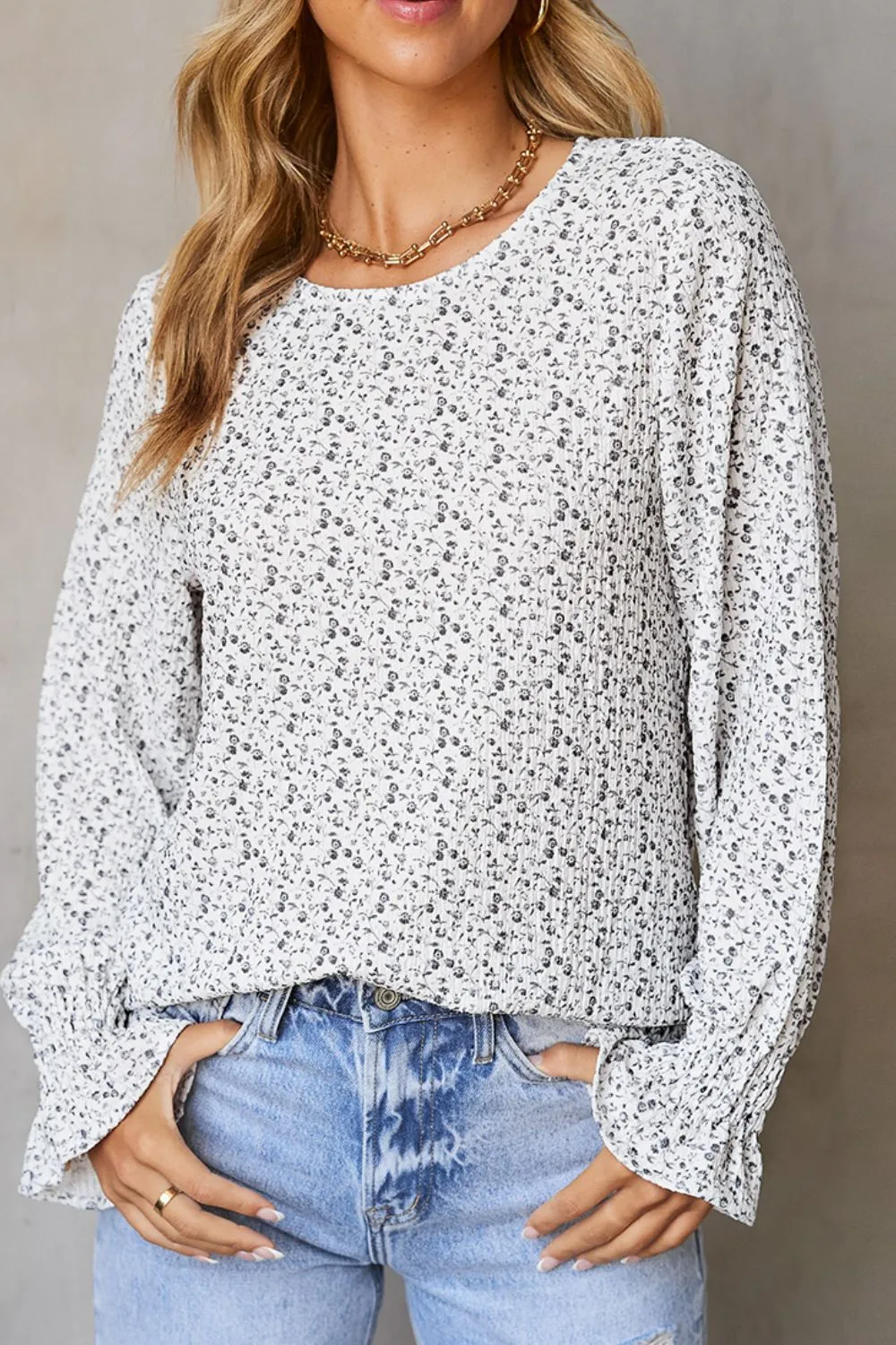 Printed Round Neck Flounce Sleeve Blouse