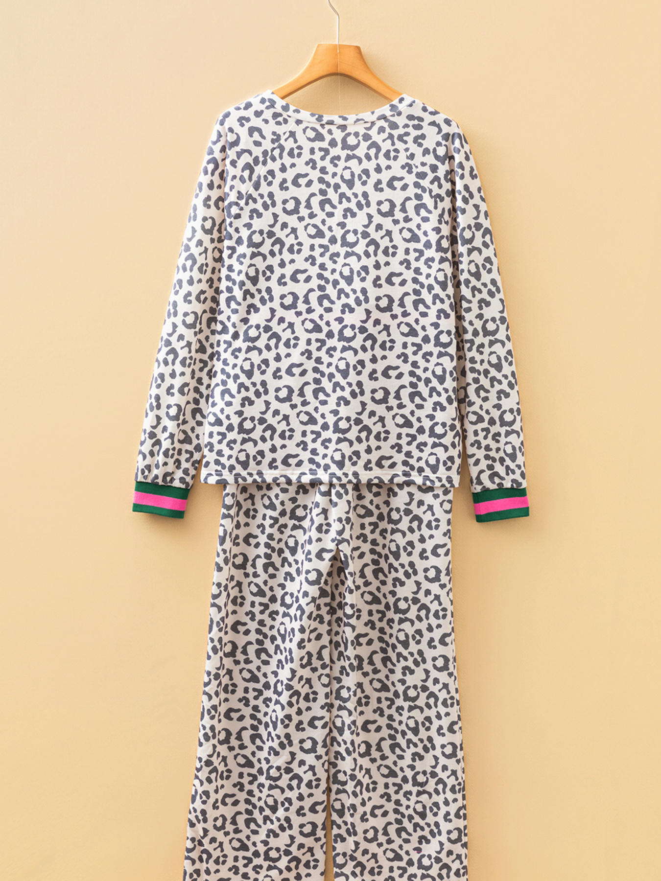 V Neck Leopard Long Sleeve Top Striped Webbing Patchwork Drawstring Pant Set